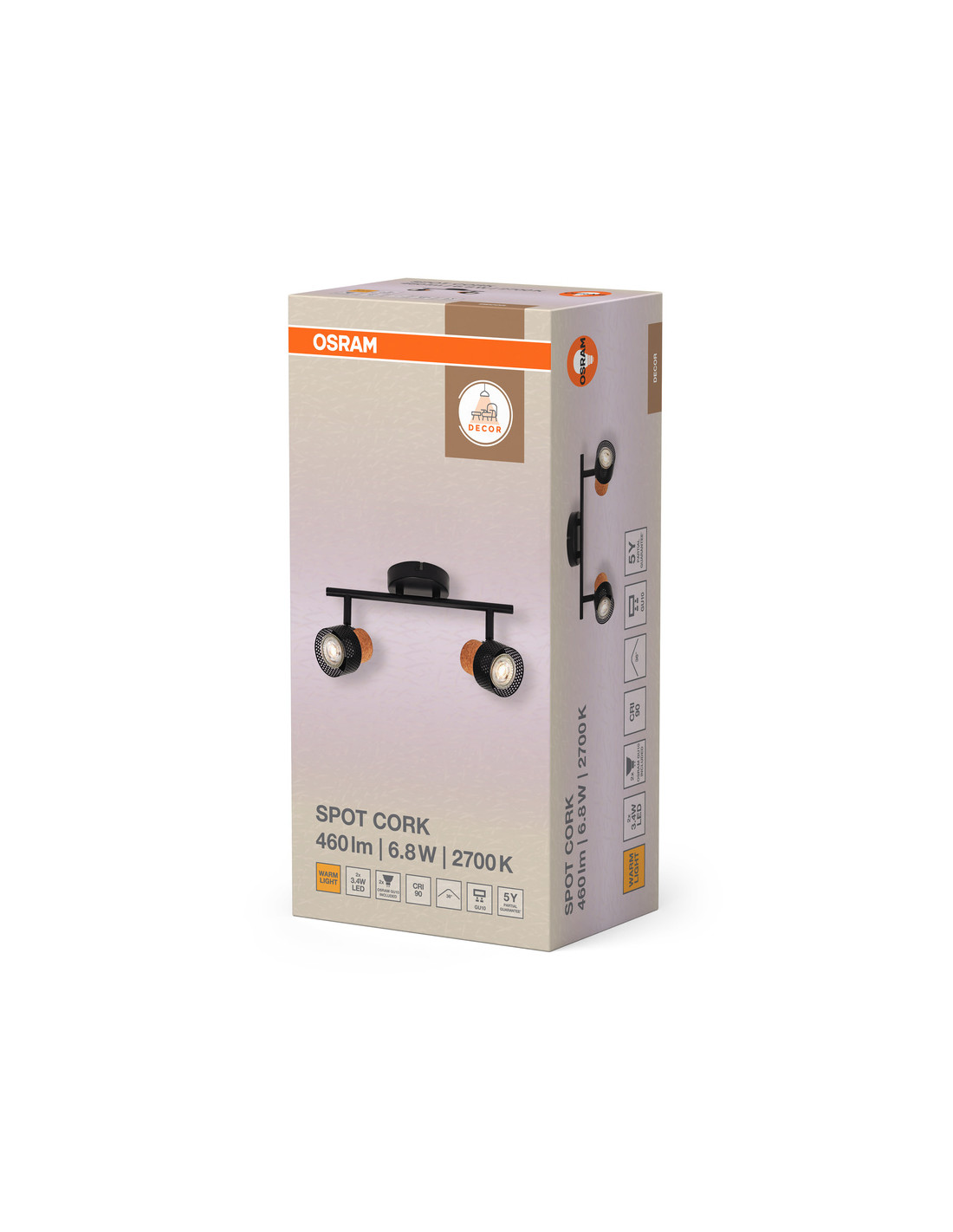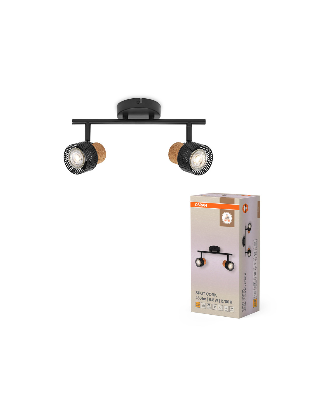 Cechy produktu: Rodzina opraw obejmuje pięć wersji z maksymalnie 4 głowicami punktowymi. Materiał obudowy: metal i korek. Regulowane oprawy. Zalety produktu: Uniwersalne rozwiązanie dzięki wymiennym lampom LED. Wysokiej jakości obudowa o białej lub czarnej matowej powierzchni. W zestawie ściemniana lampa OSRAM. Łatwy montaż. Obszary zastosowań: Zastosowania wewnętrzne. Korytarze, wejścia, klatki schodowe, pokoje dzienne, sutereny. Kuchnie, przestrzenie robocze. Montaż powierzchniowy na suficie i ścianach. Wyposażenie / Akcesoria: Kompletne akcesoria do montażu i podłączenia w zestawie. Porady dotyczące bezpieczeństwa: Wszystkie podłączenia elektryczne muszą być wykonane przez osobę wykwalifikowaną.. Uwaga, ryzyko porażenia prądem.. Produkt w klasie ochrony I. Wszystkie przewodzące prąd, metalowe części obudowy, które mogą absorbować napięcie podczas pracy lub podczas konserwacji w przypadku awarii, muszą być stale PODŁĄCZONE do przewodu uziemiającego..