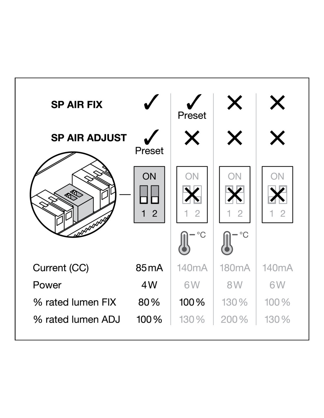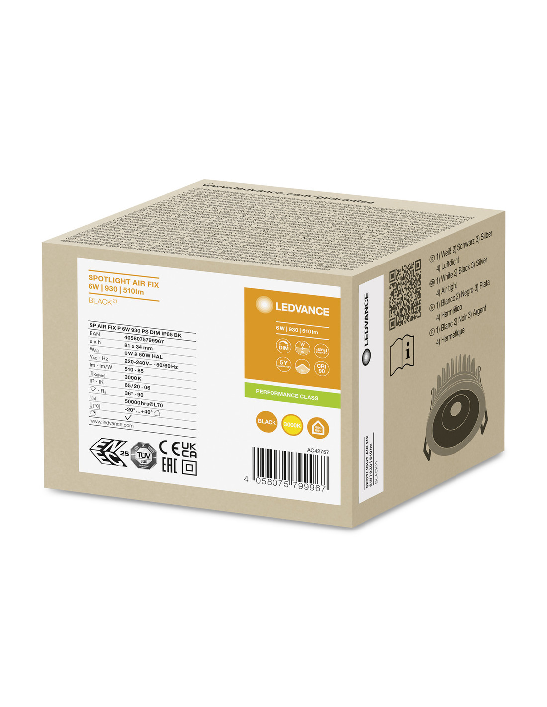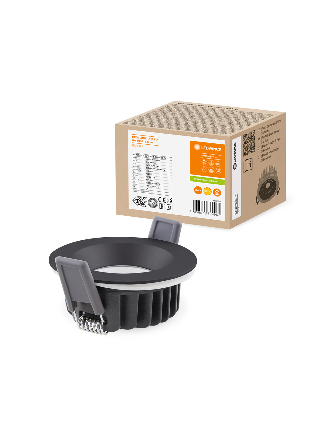 Cechy produktu: Wskaźnik oddawania barw Ra: 90. Stopień ochrony: IP65 (od strony pomieszczenia). Obudowa z odlewu ciśnieniowego aluminium. Sprężyny zabezpieczone podkładkami silikonowymi. Ściemnialne (za pomocą licznych popularnych ściemniaczy, zobacz więcej www.ledvance.pl/dim). Możliwość wykorzystania wewnętrznego okablowania. Zalety produktu: Hermetyczna konstrukcja zapewniająca mniejsze ulatnianie się powietrza i ograniczoną utratę energii. Możliwość pokrycia wieloma rodzajami materiałów termoizolacyjnych. Niski profil umożliwia instalację w płytkich przestrzeniach sufitowych. Powerselect: Regulacja mocy za pomocą przełączników DIP na sterowniku. Łatwa wymiana zewnętrznego zasilacza dzięki wtyczce z zatrzaskiem bagnetowym. Łatwa instalacja i podłączenie elektryczne dzięki beznarzędziowym złączom elektrycznym. SCALE Design – świetny wygląd, wysokiej jakości materiały i niewielkie wymiary wpasowują się w każde otoczenie. 5-letnia gwarancja. Obszary zastosowań: Bezpośredni zamiennik halogenowych opraw reflektorowych. Sufity w domach energooszczędnych. Oświetlenie ogólne. Pokoje hotelowe i korytarze. Bary, restauracje. Oświetlenie akcentujące. Pomieszczenia mieszkalne. Wyposażenie / Akcesoria: Zewnętrzny osprzęt sterujący w zestawie z przełącznikami DIP do wyboru mocy podczas instalacji. Porady prawne: Należy przestrzegać wskazówek dotyczących instalacji znajdujących się w aktualnej instrukcji użytkownika (www.ledvance.com). Porady dotyczące bezpieczeństwa: W przypadku zastosowania folii paroizolacyjnej należy zastosować przekładkę SP HOLDER!. Wszystkie podłączenia elektryczne muszą być wykonane przez osobę wykwalifikowaną.. Uwaga, ryzyko porażenia prądem..