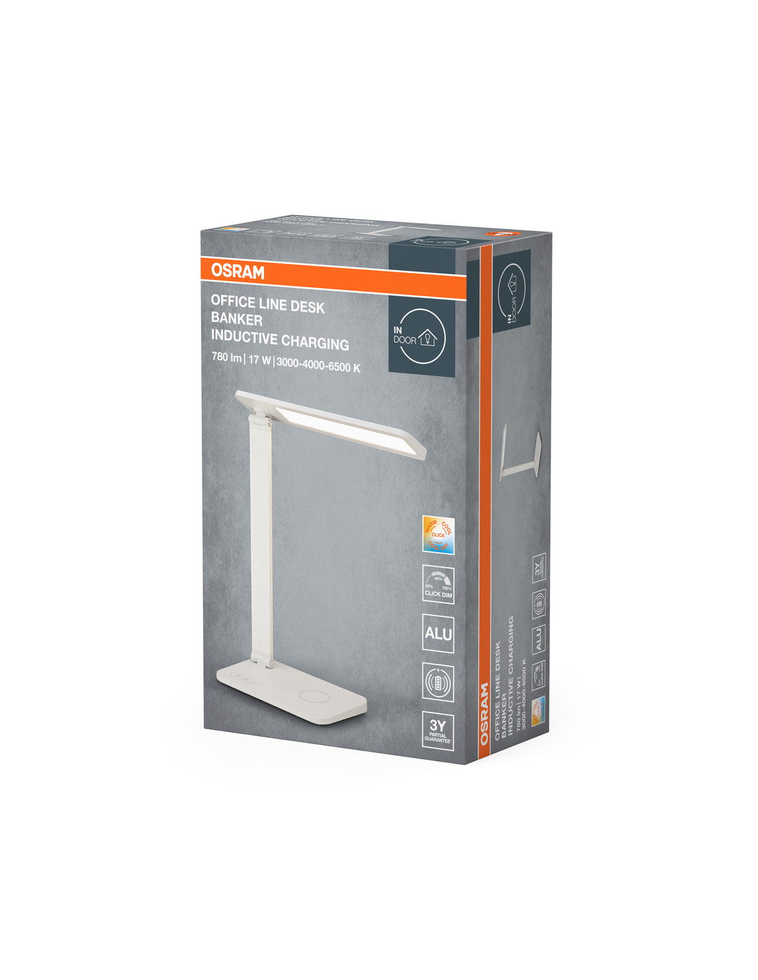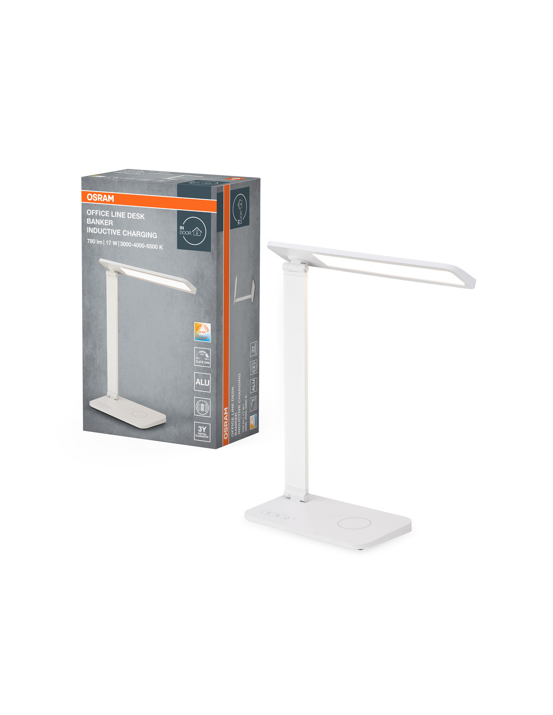 Cechy produktu: Oprawa biurkowa o ponadczasowym wzornictwie i z regulowaną głowicą oprawy. Regulowana temperatura barwowa światła: 3000 K, 4000 K, 6500 K. Materiał: aluminium (obudowa), poliwęglany (dyfuzor). Trwałość: do 25 000 h. Zalety produktu: Indukcyjna powierzchnia ładowania w podstawie. Wysoka wszechstronność dzięki możliwości wyboru CCT. Zapewnia chłodne białe światło tworzące atmosferę aktywności oraz ciepłe białe światło tworzące relaksujący nastrój. Przełączenie i 3-stopniowe przyciemnianie za pomocą dotykowego czujnika w postawie oprawie oświetleniowej. Obrotowa głowica oprawy umożliwiająca indywidualne ustawienie źródła światła. Wykonano z wysokiej jakości aluminium. Obszary zastosowań: Pomieszczenia codziennego użytku. Stoliki, biurka. Biura w domu. Wyposażenie / Akcesoria: Wyposażony w przewód o długości 1,8 m i wtyczkę. Porady dotyczące bezpieczeństwa: Aby ograniczyć ryzyko uduszenia, elastyczne przewody PODŁĄCZONE do tej oprawy należy solidnie przymocować do ściany, jeśli znajdują się w zasięgu ręki..