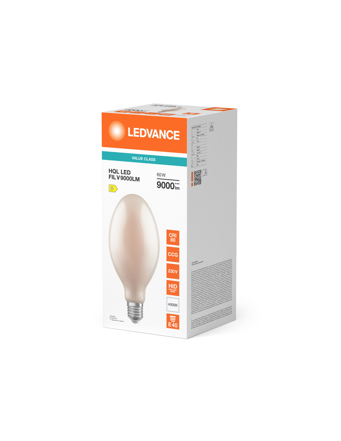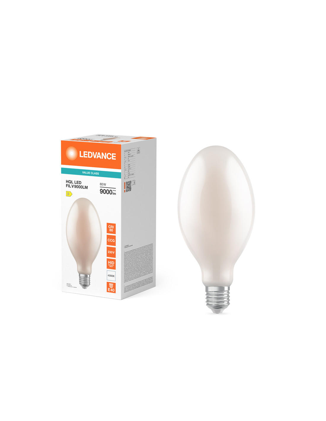 Cechy produktu: Zamiennik lamp rtęciowych HQL: nadaje się do zasilania przez tradycyjny statecznik magnetyczny (CCG) do lamp HQL lub bezpośrednio z sieci 230 V. Współczynnik mocy: 0,9. Stopień ochrony: IP65. Zabezpieczenie przeciwprzepięciowe: do 2 kV (L-N). Zalety produktu: Taka sama konstrukcja jak tradycyjne lampy HQL z matową, elipsoidalną, w pełni szklaną bańką. Pełne wykorzystanie odbłyśnika w istniejącej oprawie oświetleniowej dzięki kątowi świecenia 360 stopni. Pozwala zaoszczędzić do 78 % energii w przypadku zastąpienia lamp rtęciowych (HQL). Natychmiast 100 % światła, bez czasu nagrzewania. Obszary zastosowań: Ulice. Oświetlenie przestrzeni. Strefy dla pieszych. Parki. Zastosowania zewnętrzne - tylko w odpowiednich oprawach. Porady dotyczące bezpieczeństwa: Nie nadaje się do pracy z zapłonnikami.. Zastosowanie kondensatora może doprowadzić do obniżenia współczynnika mocy systemu.. W przypadku montażu poziomego punkt tc lampy powinien znajdować się w górnej części lampy.. Zastosowanie w małych i wąskich oprawach z wąskimi odbłyśnikami nie jest rekomendowane. Prawidłowa praca w temperaturze otoczenia do 50 °C wewnątrz oprawy. Nie zaleca się stosowania w małych oprawach i oprawach z małymi odbłyśnikami.. Wszystkie podłączenia elektryczne muszą być wykonane przez osobę wykwalifikowaną..