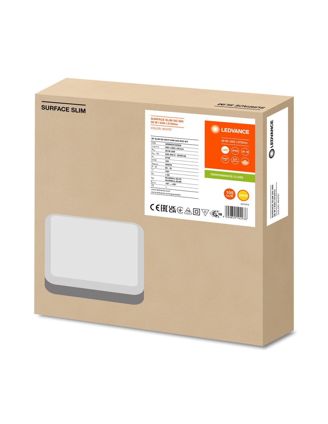 PLAFON SURFACE SLIM SQ 260 P 26W 3000K ciepła biała IP65 IK10
