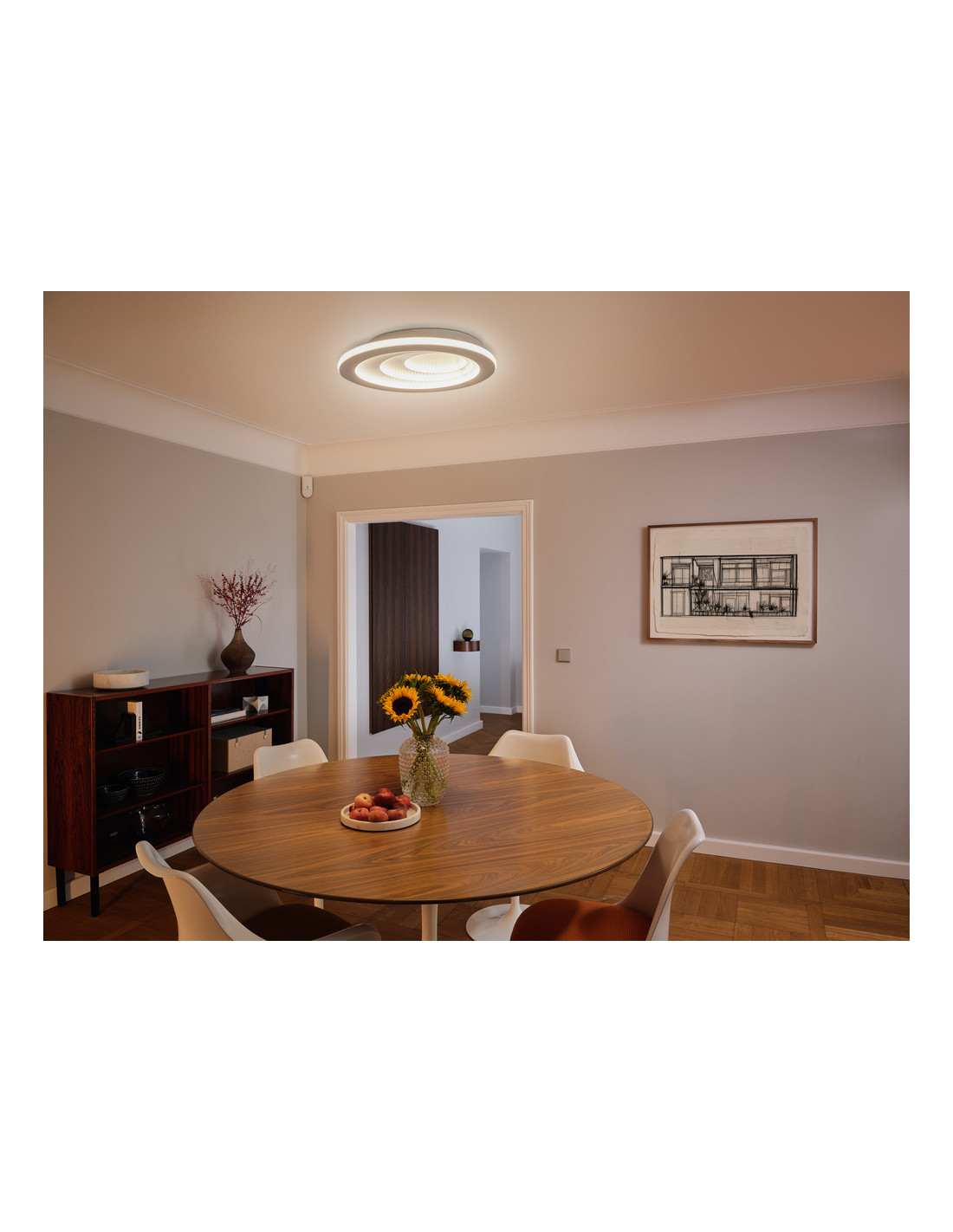 Cechy produktu: Dekoracyjne oświetlenie dekoracyjne. Sufitowa oprawa oświetleniowa o zaawansowanej technologii LED. Zalety produktu: Bardzo jednorodne światło. Eleganckie wzornictwo. Obszary zastosowań: Zastosowania wewnętrzne. Kuchnie, salony, pokoje dziecięce i pokoje do pracy. Porady dotyczące bezpieczeństwa: Wszystkie podłączenia elektryczne muszą być wykonane przez osobę wykwalifikowaną.. Uwaga, ryzyko porażenia prądem.. Produkt w klasie ochrony I. Wszystkie przewodzące prąd, metalowe części obudowy, które mogą absorbować napięcie podczas pracy lub podczas konserwacji w przypadku awarii, muszą być stale PODŁĄCZONE do przewodu uziemiającego.. Sprawdź przydatność ściany i sufitu. Jeśli nie jesteś pewien, zasięgnij profesjonalnej porady..