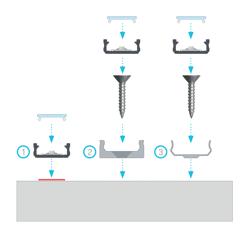 Instrukcja montażu profilu D z kloszem BASIC za pomocą (1) taśmy dwustronnej, (2) uchwytu montażowego D MINI, (3) uchwytu montażowego metalowego D
