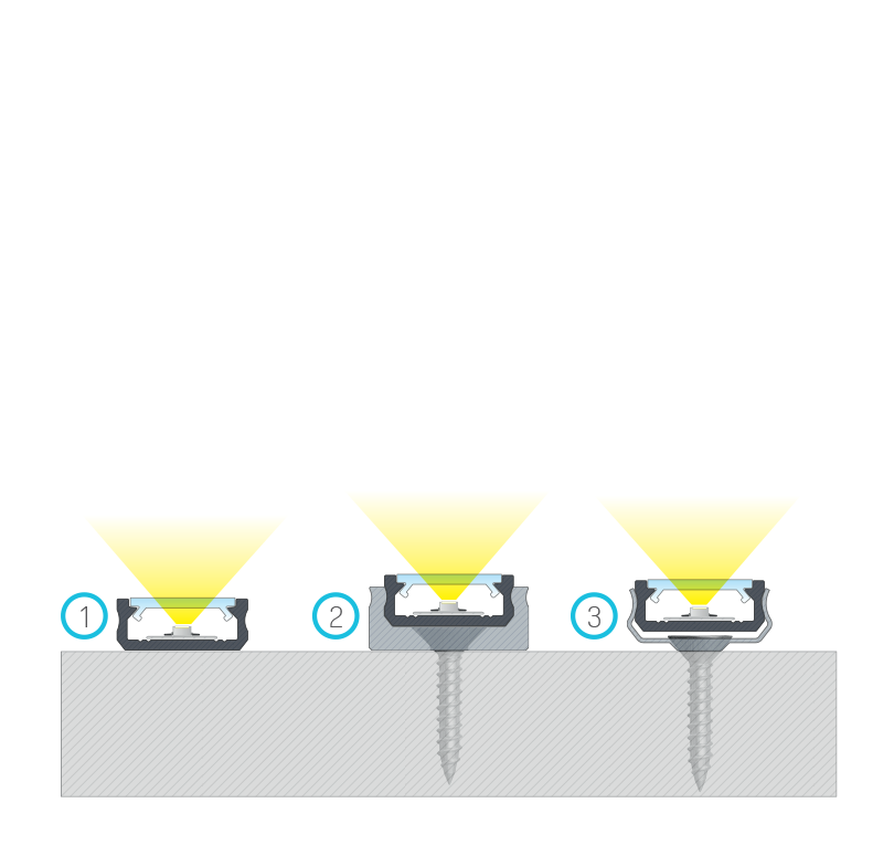 Efekt końcowy montażu profilu D z kloszem BASIC za pomocą (1) taśmy dwustronnej, (2) uchwytu montażowego D MINI, (3) uchwytu metalowego D