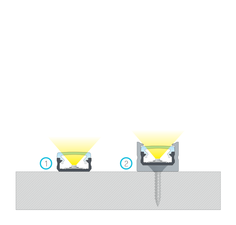 Efekt końcowy montażu profilu D z kloszem HIGH za pomocą (1) taśmy dwustronnej, (2) uchwytu montażowego D HIGH