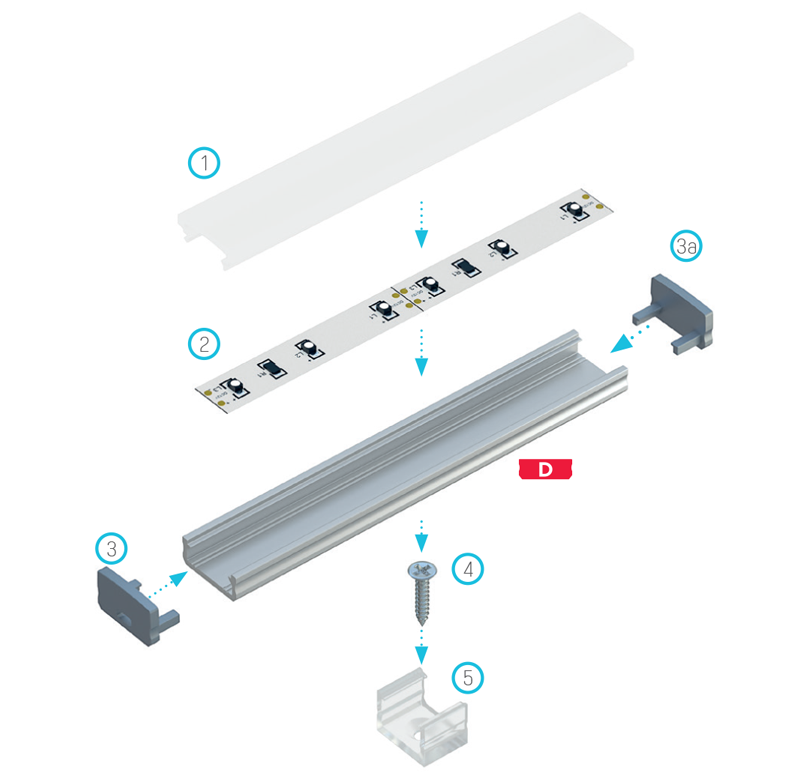 Schemat złożenia elementów systemu oświetleniowego z wykorzystaniem profilu D oraz (1) klosza BASIC, (2) taśmy LED, (3) zaślepki z otworem, (3a) zaślepki bez otworu, (4) wkrętu montażowego, (5) uchwytem montażowego D MINI