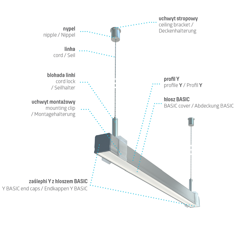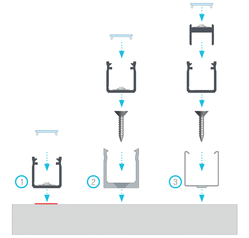 Instrukcja montażu profilu Y z kloszem BASIC za pomocą (1) taśmy dwustronnej, (2) uchwytu montażowego Y, (3) profilu pomocniczego Y M1 oraz uchwytu metalowego Y