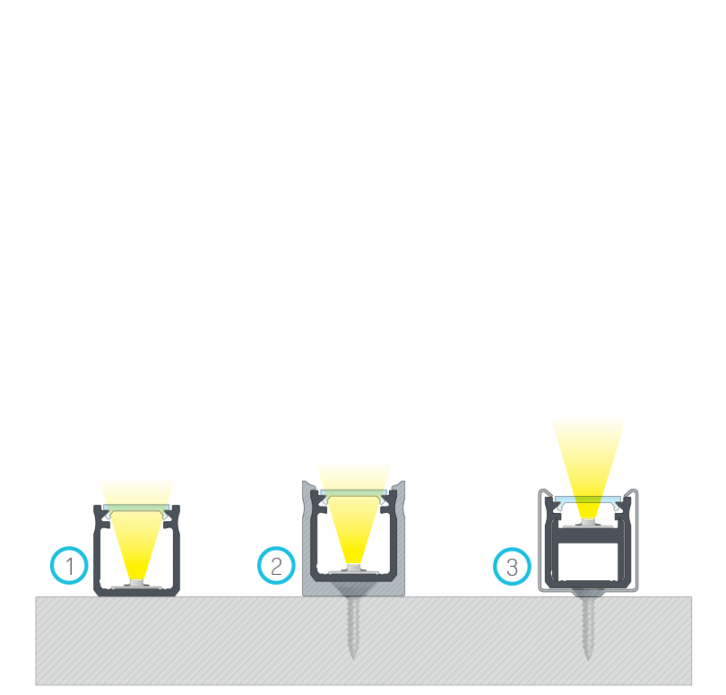 Efekt końcowy montażu profilu Y z kloszem BASIC za pomocą (1) taśmy dwustronnej, (2) uchwytu montażowego Y, (3) profilu pomocniczego Y M1 oraz uchwytu metalowego Y