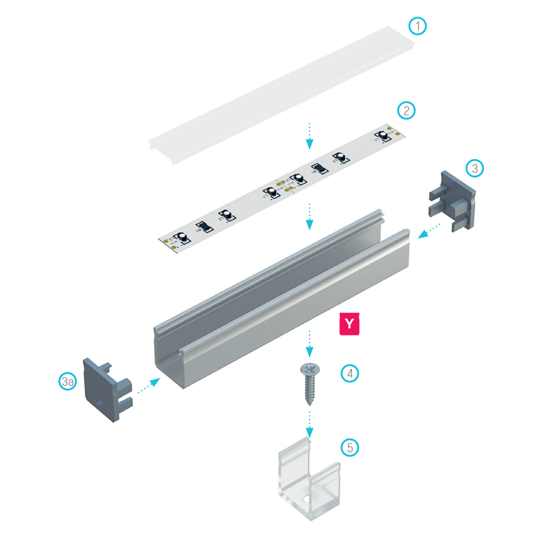Schemat złożenia elementów systemu oświetleniowego z wykorzystaniem profilu Y oraz (1) klosza BASIC, (2) taśmy LED, (3) zaślepki bez otworu, (3a) zaślepki z otworem, (4) wkrętu, (5) uchwytu montażowego Y