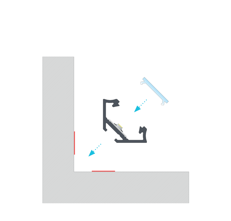 Efekt końcowy montażu profilu C kątowego z kloszem BASIC za pomocą taśmy dwustronnej