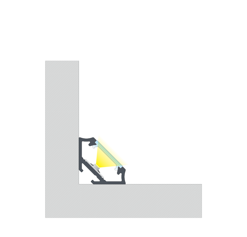 Profil aluminiowy LUMINES C narożny o kącie nachylenia taśmy LED równym 45 stopni. Jeden z najbardziej minimalistycznych i nowoczesnych projektów. Świetnie nadający się do designerskich połączeń dwóch prostopadłych powierzchni oraz wszędzie tam, gdzie konieczne jest skierowanie światła wychodzącego z profilu pod kątem 45 stopni.