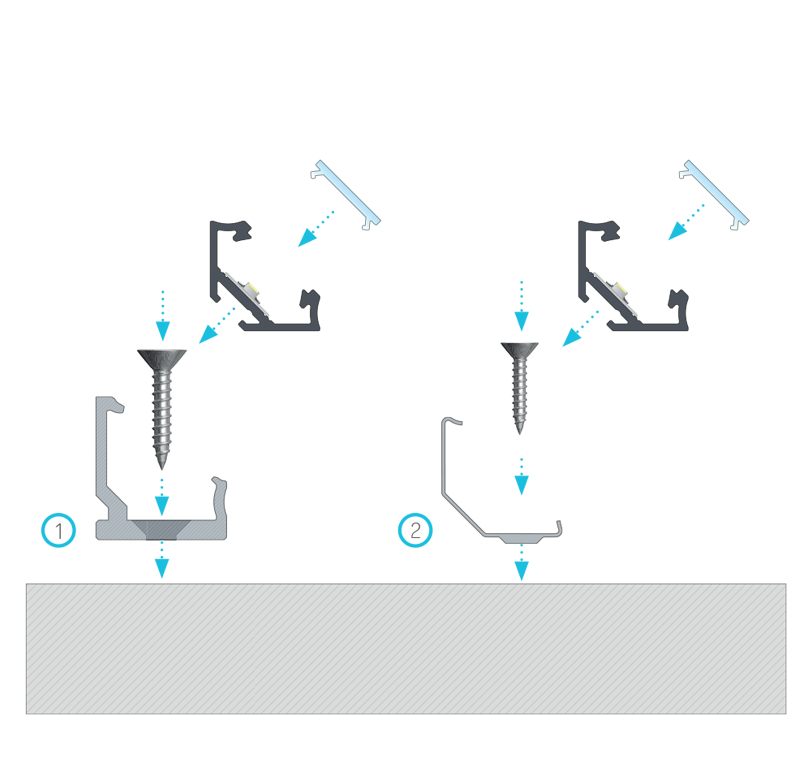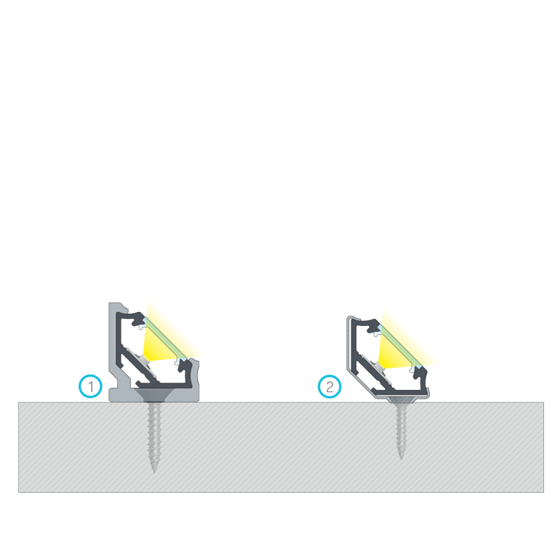 Instrukcja montażu profilu C kątowego z kloszem BASIC za pomocą (1) uchwytu montażowego CH z tworzywa, (2) uchwytu montażowego metalowego CH