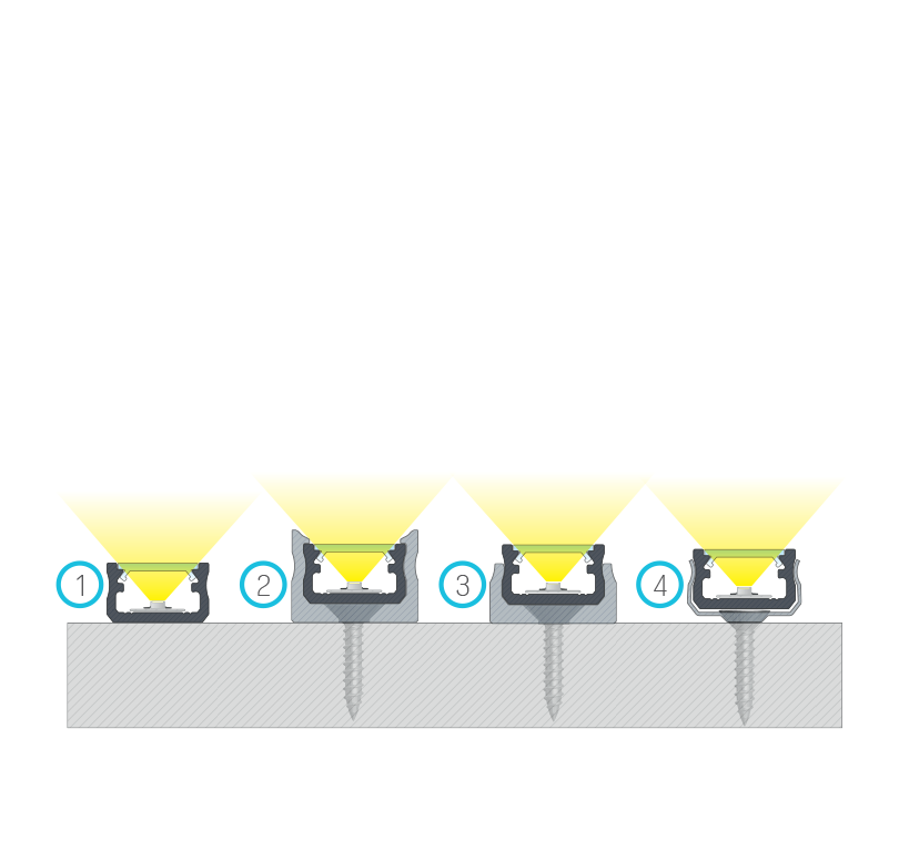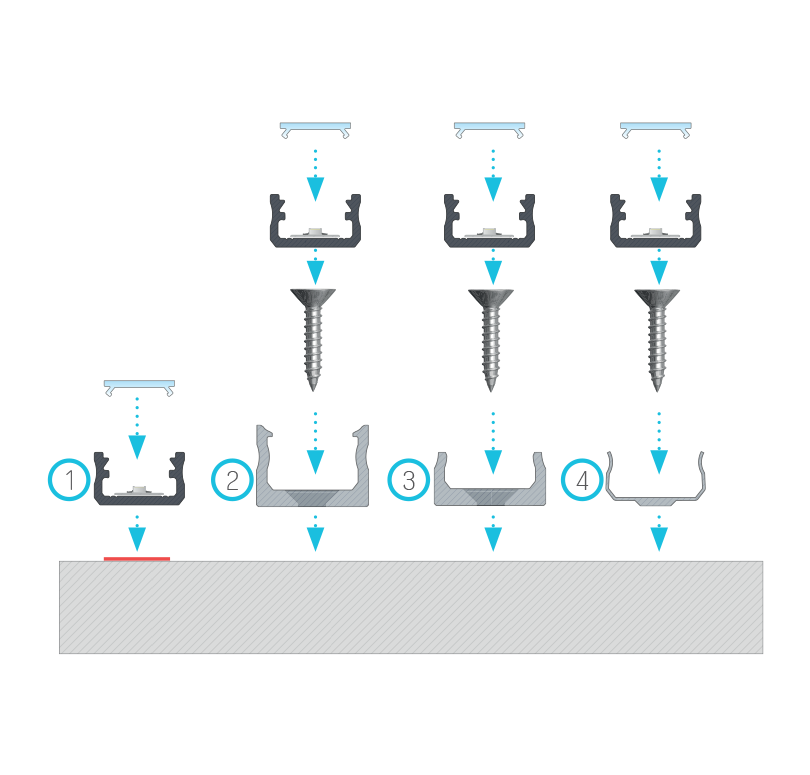 Efekt końcowy montażu profilu A z kloszem BASIC, (1) z taśmą dwustronną, (2) z uchwytem montażowym A, (3) z uchwytem A MINI, (4) z uchwytem metalowym A