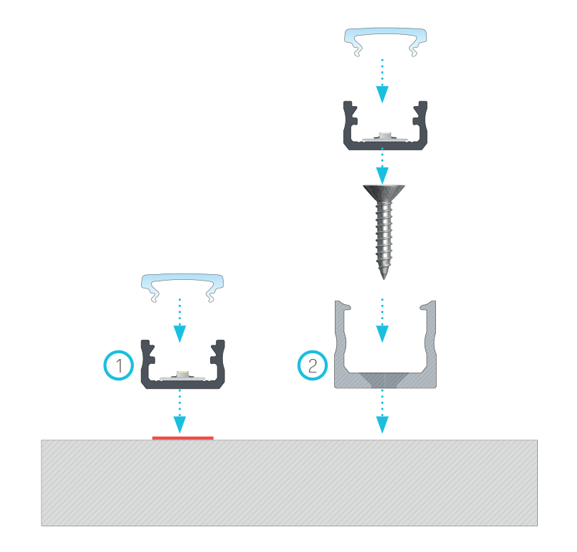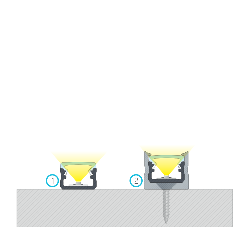 Efekt końcowy montażu profilu A z kloszem HIGH, (1) z taśmą dwustronną, (2) z uchwytem montażowym A HIGH