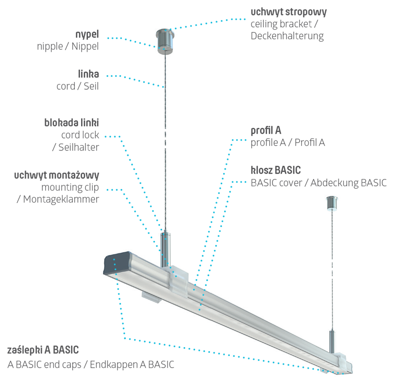 - dedykowane zaślepki z tworzywa sztucznego ABS do profili z kloszem BASIC w 5 odmianach kolorystycznych (z otworem i bez otworu)