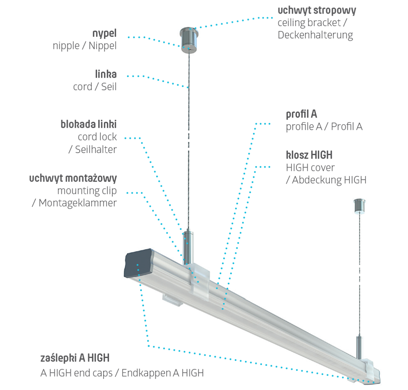 - dedykowane zaślepki z tworzywa sztucznego ABS do profili z kloszem HIGH w 5 odmianach kolorystycznych (z otworem i bez otworu)