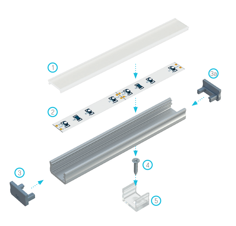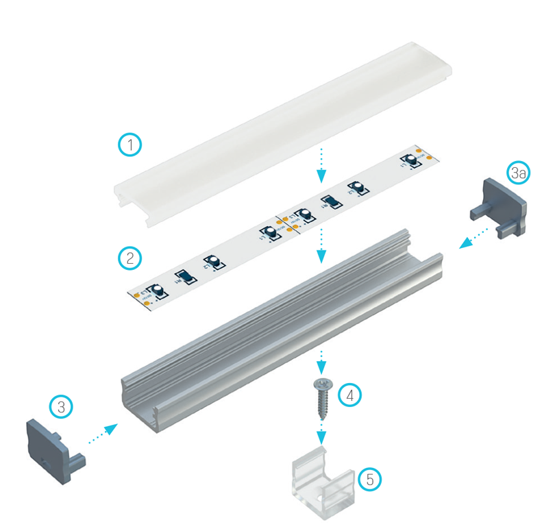 Schemat złożenia elementów systemu oświetleniowego z wykorzystaniem profilu A oraz (1) klosza BASIC, (2) taśmy LED, (3) zaślepki z otworem, (3a) zaślepki bez otworu, (4) wkrętu montażowego, (5) uchwytu montażowego A MINI