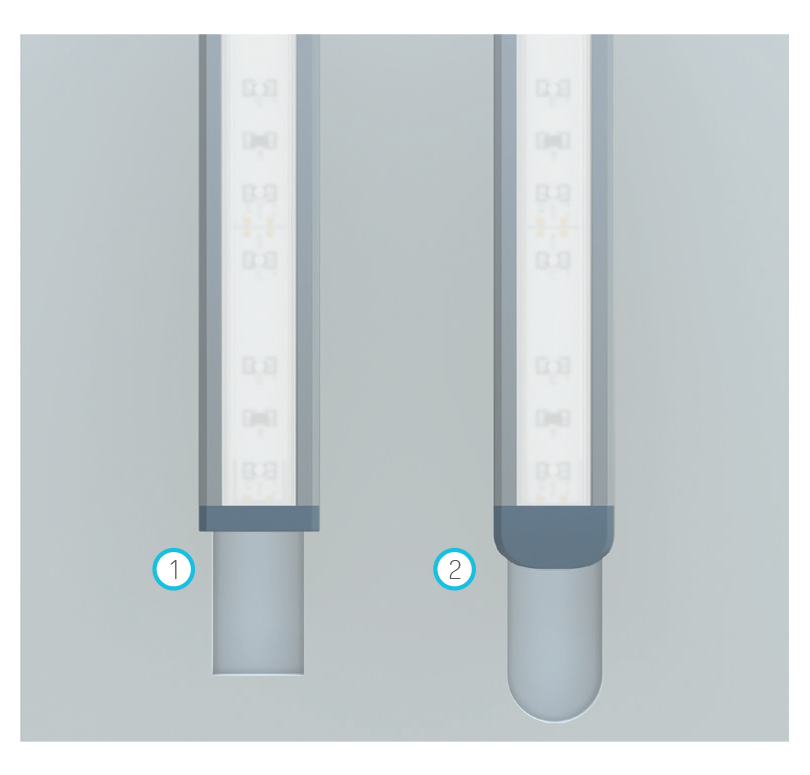 Schemat złożenia elementów systemu oświetleniowego z wykorzystaniem profilu B oraz (1) klosza BASIC, (2) taśmy LED,(3) zaślepek z wykończeniem okrągłym z otworami