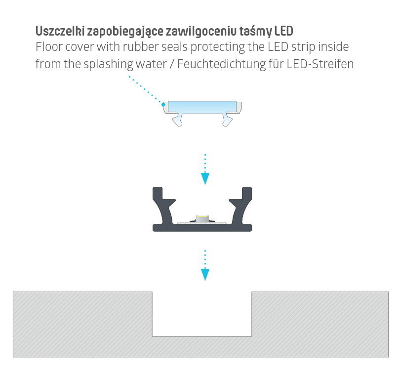 Zaprojektowany z myślą o zastosowaniu podłogowym. Dzięki uszczelniającemu kloszowi zapobiegającemu zawilgoceniu taśmy LED, może być stosowany również w miejscach narażonych na pojawienie się wilgoci.