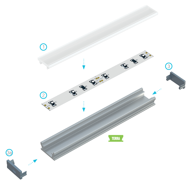 Schemat złożenia elementów systemu oświetleniowego z wykorzystaniem profilu TERRA oraz (1) klosza podłogowego, (2) taśmy LED, (3) zaślepki bez otworu, (3a) zaślepki z otworem