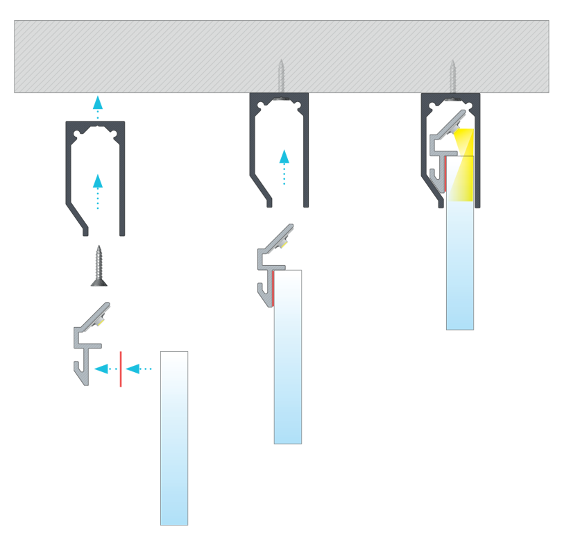 Schemat kolejności montażu profili szybowych I6/I10 za pomocą taśmy dwustronnej, profilu pomocniczego FARI i wkrętu montażowego