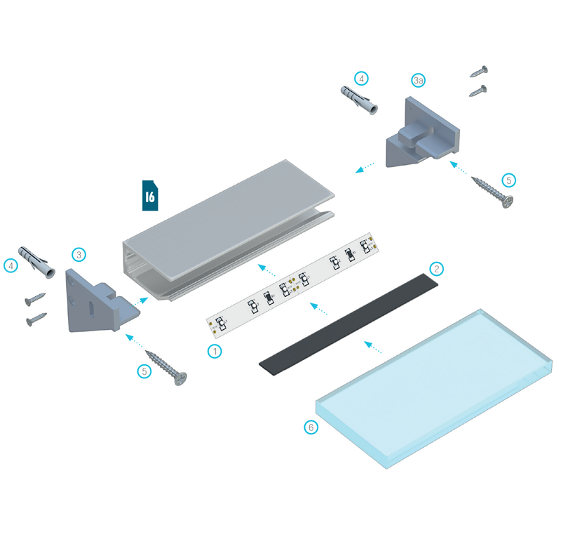Schemat złożenia elementów systemu oświetleniowego z wykorzystaniem profilu I10 oraz (1) taśmy LED, (2) taśmy dwustronnej, (3) zaślepki montażowej z podporą z otworem, (3a) zaślepki montażowej z podporą bez otworu, (4) kołków montażowych, (5) wkrętów montażowych, (6) plexi/szyby.