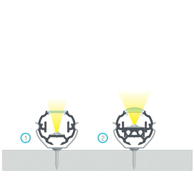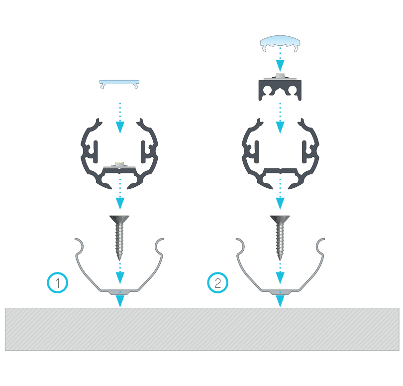 Instrukcja montażu profilu okrągłego COSMO z (1) kloszem BASIC, (2) kloszem BASIC LENS 30 z wykorzystaniem profilu pomocniczego COSMO M1 oraz uchwytu montażowego metalowego COSMO