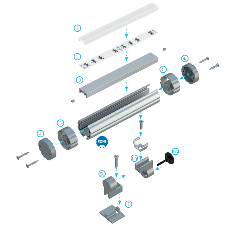 Schemat złożenia elementów systemu oświetleniowego z wykorzystaniem profilu okrągłego COSMO oraz (1) klosza BASIC LENS 30, (2) taśmy LED, (3) profilu COSMO M1, (4) zaślepki regulacyjnej z otworem, (4a) zaślepki regulacyjnej bez otworu, (5) pierścieni regulacyjnych, (6a) elementu przegubu żeńskiego, (6b) elementu przegubu męskiego, (6c) śruby radełkowanej, (7) podstawki