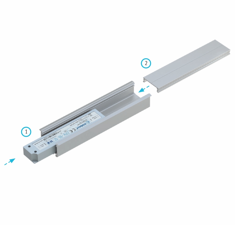 Schemat złożenia elementów systemu oświetleniowego przy wykorzystaniu profilu INSO wpuszczanego oraz (1) zasilacza LED, (2) profilu montażowego MODI