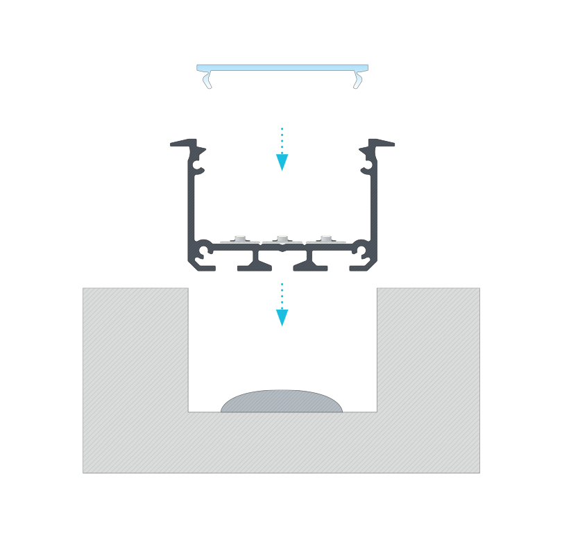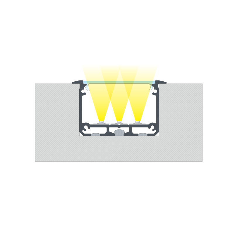 Efekt końcowy montażu profilu INSO wpuszczanego z kloszem WIDE w wyfrezowanym otworze z dodatkiem kleju montażowego