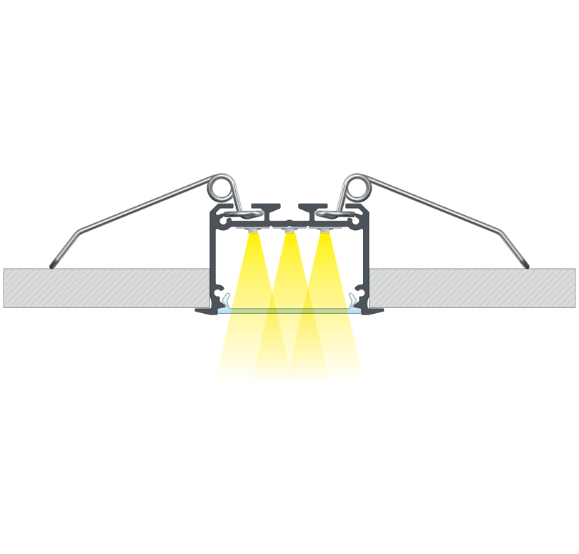 Efekt końcowy montażu profilu INSO z kloszem WIDE wpuszczonego pomiędzy płytami przy pomocy sprężyn montażowych