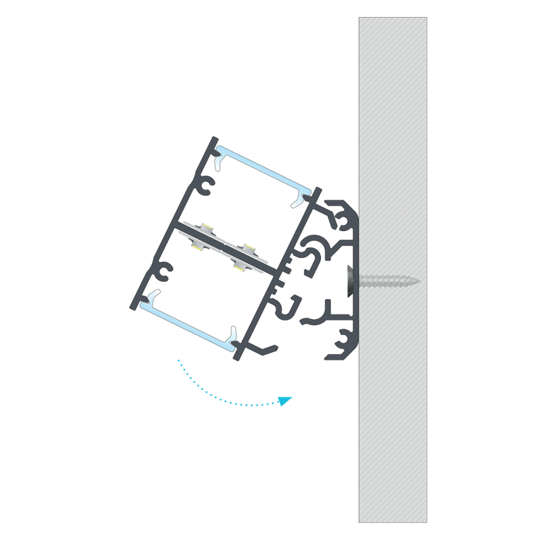 Zasada montażu profilu DOPIO z kloszami DOUBLE z wykorzystaniem wkrętu montażowego oraz profilu montażowego TALIA M1