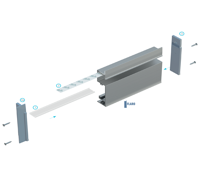 Schemat złożenia elementów systemu oświetleniowego z wykorzystaniem profilu FLARO (1) klosza BASIC, (2) taśmy LED, (3) zaślepki FLARO z wykończeniem prostym, (3a) zaślepki FLARO z wykończeniem pełnym.