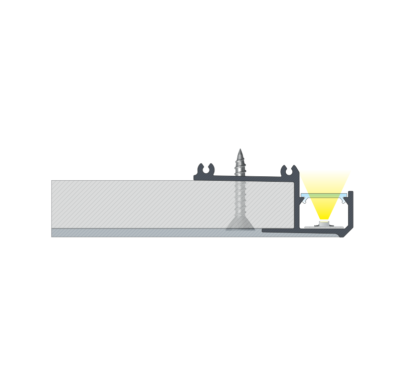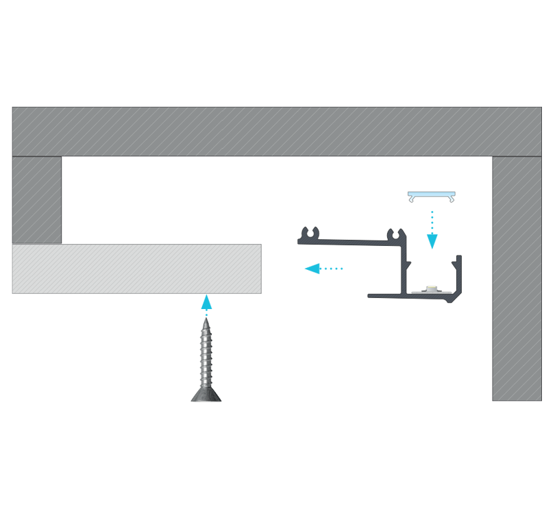 Przykład montażu profilu sufitowego IPA16 w płycie gipsowej o grubości 15,8 mm pod kątem prostym.