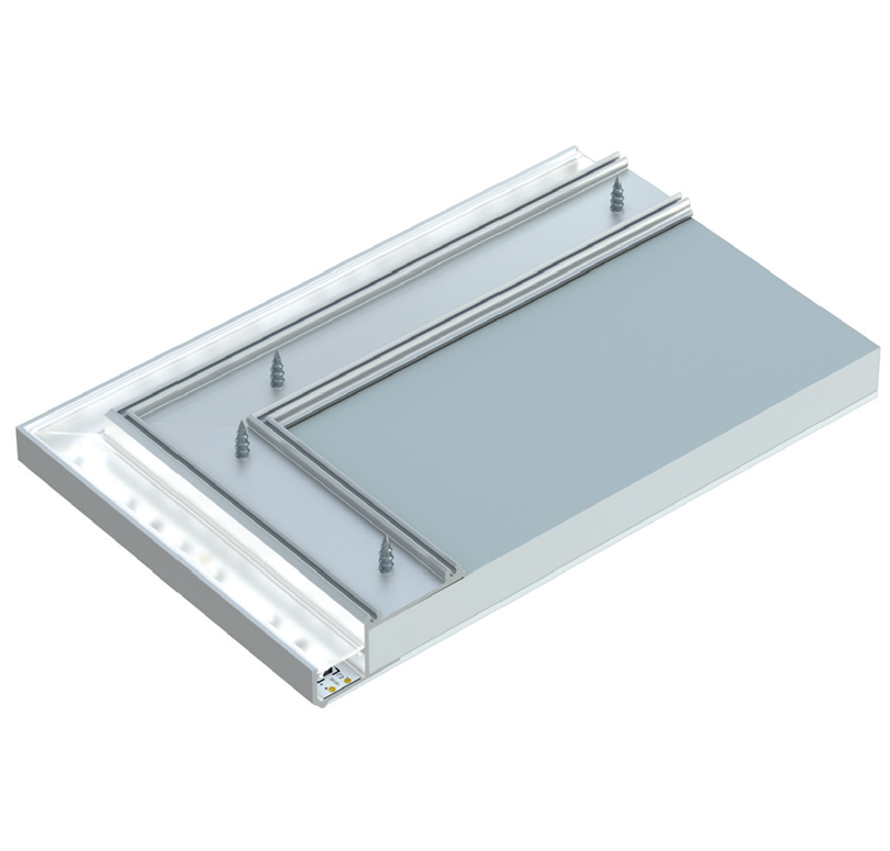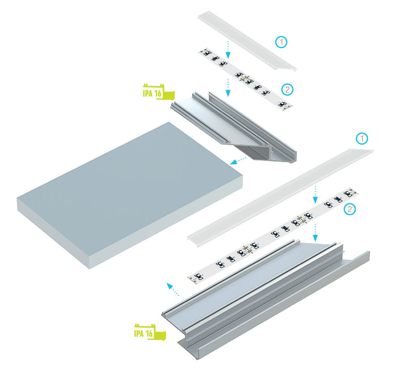 Schemat złożenia elementów systemu oświetleniowego z wykorzystaniem profilu IPA16 (1) klosza BASIC, (2) taśmy LED.