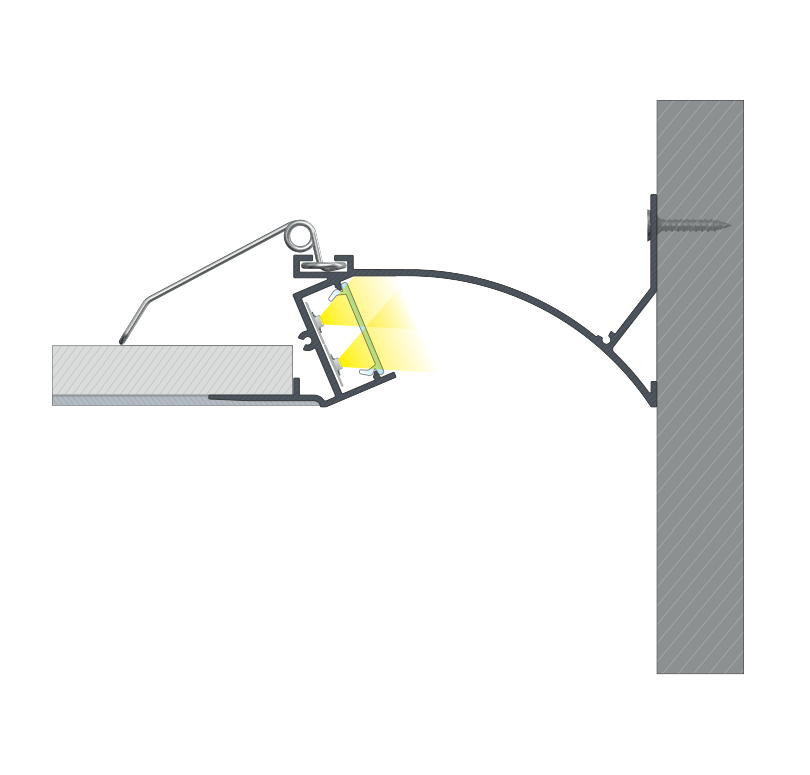 Efekt końcowy montażu profilu TOPO z kloszem DOUBLE z wykorzystaniem sprężyny montażowej w systemie sufitów podwieszanych z zagipsowanym fragmentem profilu.
