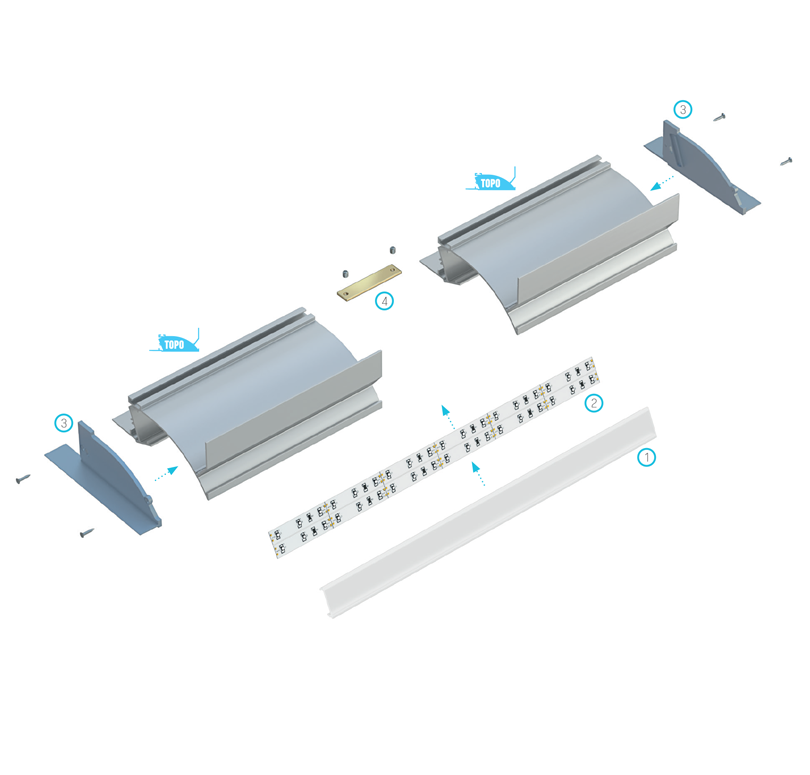Schemat złożenia elementów systemu oświetleniowego z wykorzystaniem profilu TOPO, (1) klosza DOUBLE, (2) taśm LED, (3) zaślepek TOPO z otworem, (4) łącznika prostego.
