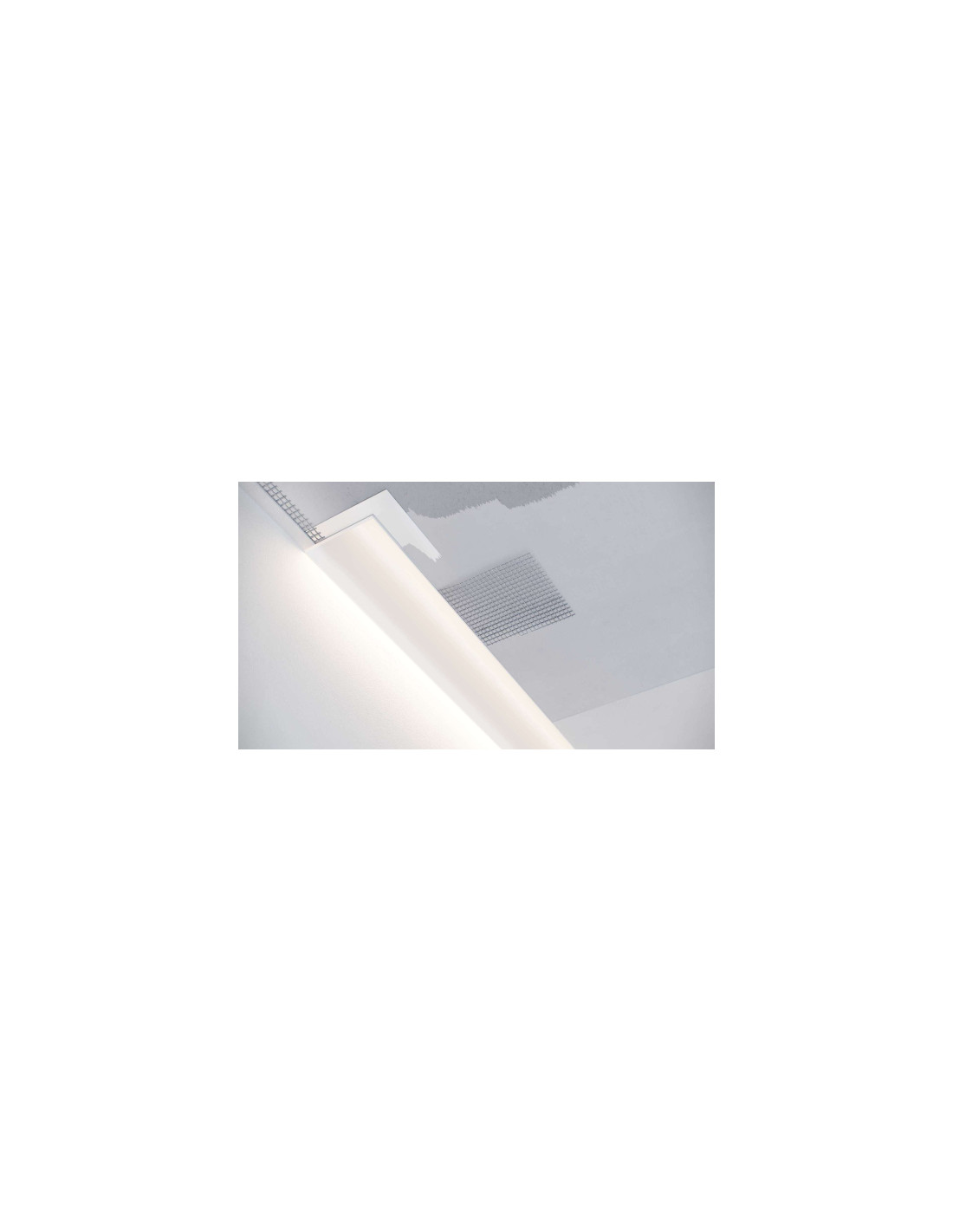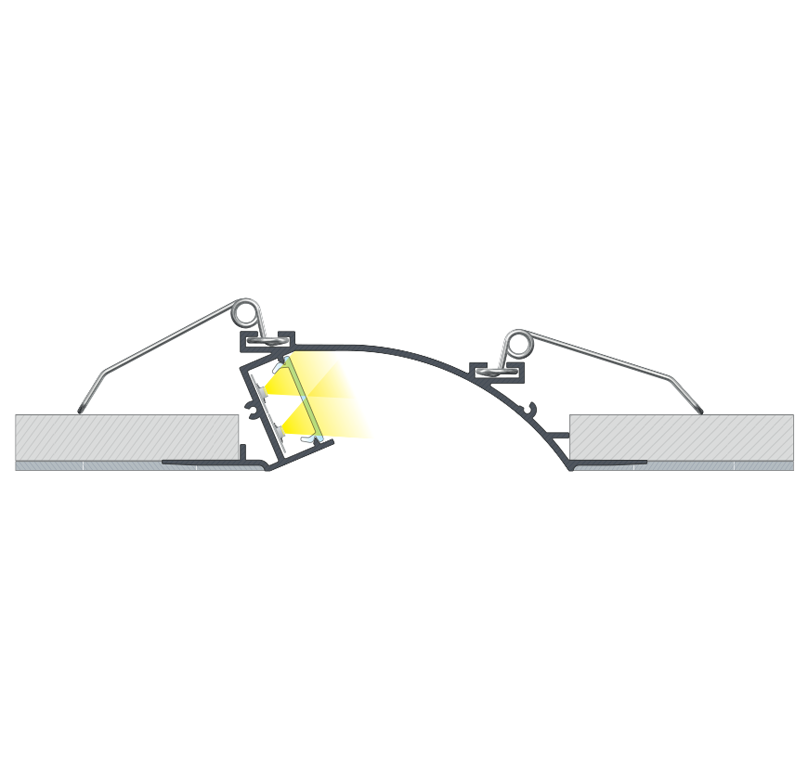 Efekt końcowy montażu profilu PERO z kloszem DOUBLE z wykorzystaniem sprężyn montażowych w systemie sufitów podwieszanych z zagipsowanym fragmentem profilu.
