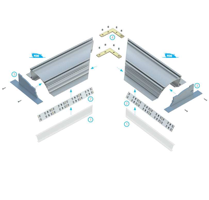 Schemat złożenia elementów systemu oświetleniowego z wykorzystaniem profilu PERO, (1) klosza DOUBLE, (2) taśm LED, (3) zaślepek PERO z otworem, (4) łączników kątowych.