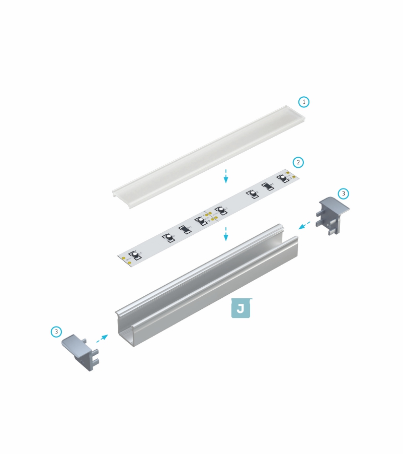 Schemat złożenia elementów systemu oświetleniowego z wykorzystaniem profilu J oraz (1) klosza BASIC, (2) taśmy LED, (3) zaślepek z otworami.