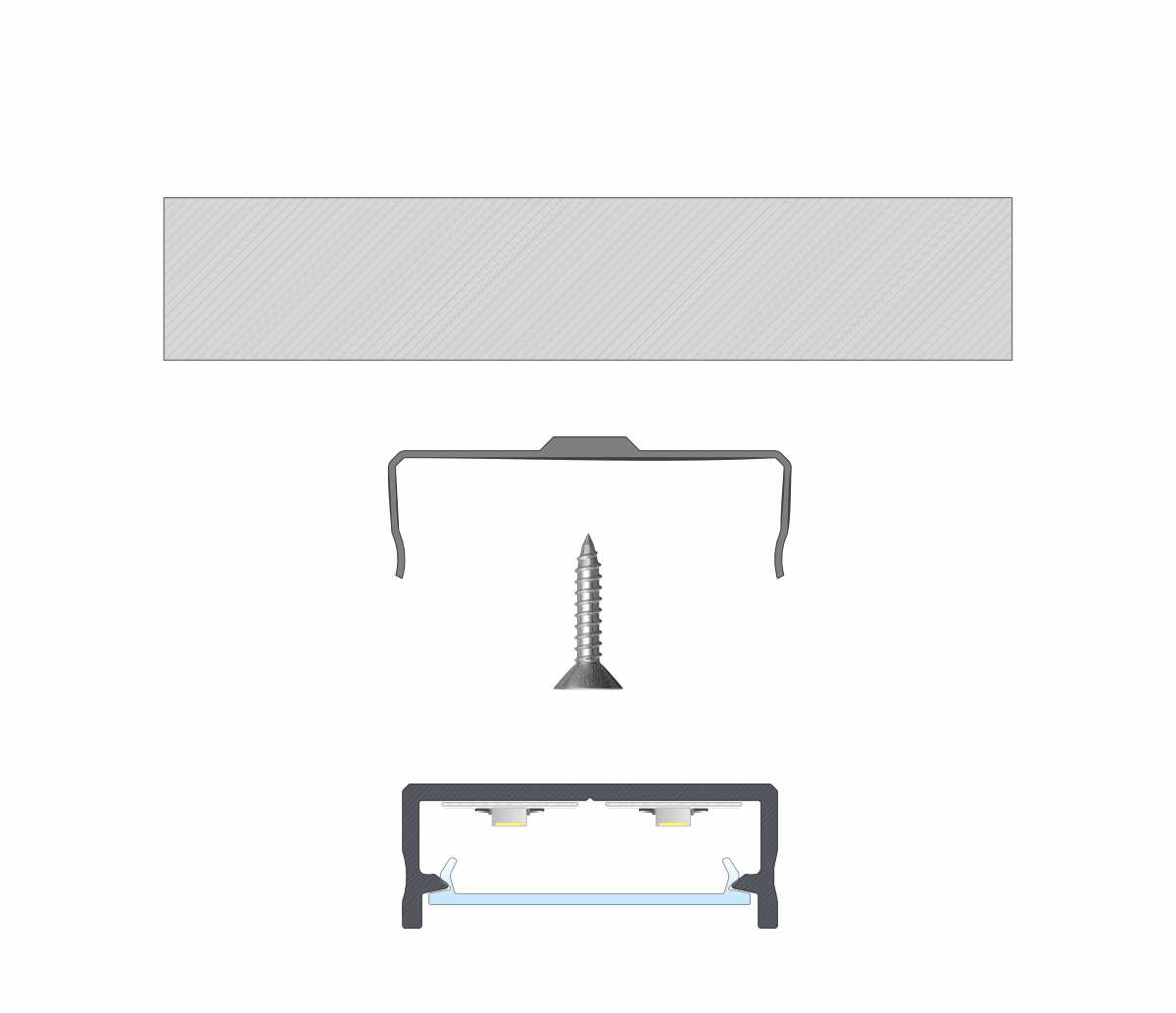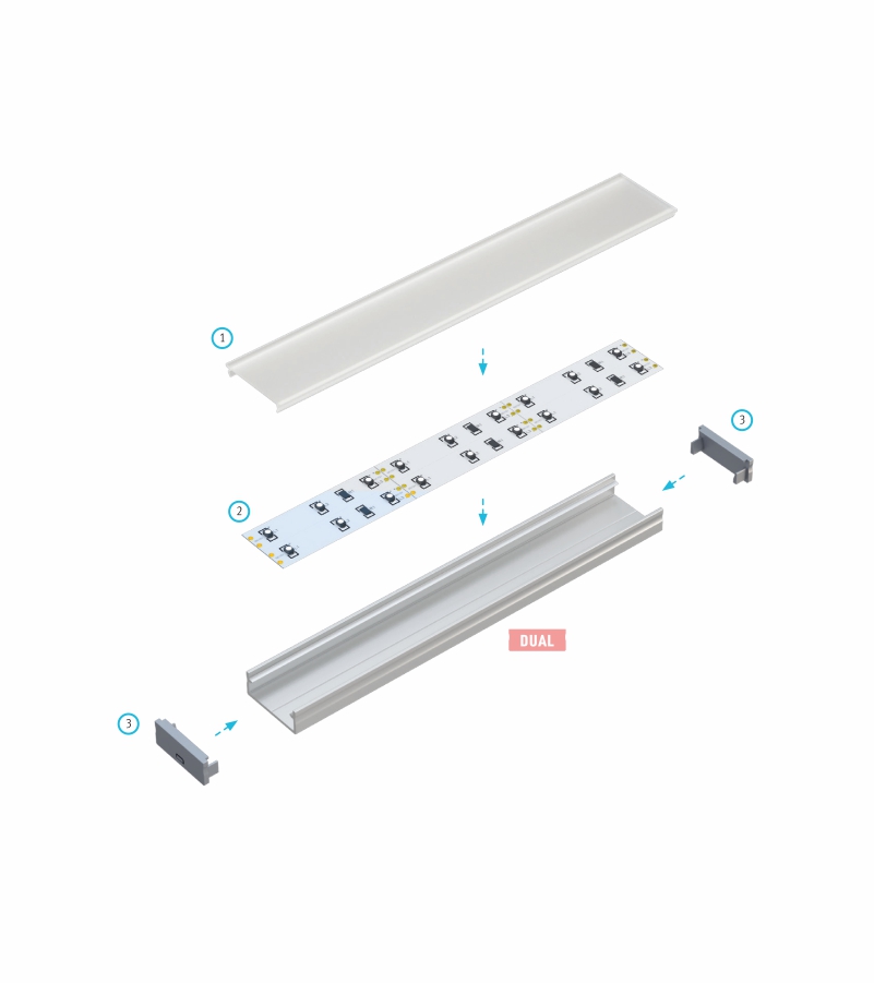 Schemat złożenia elementów systemu oświetleniowego z wykorzystaniem profilu DUAL oraz (1) klosza DOUBLE, (2) dwóch taśm LED i (3) zaślepek z otworem trasowanym.