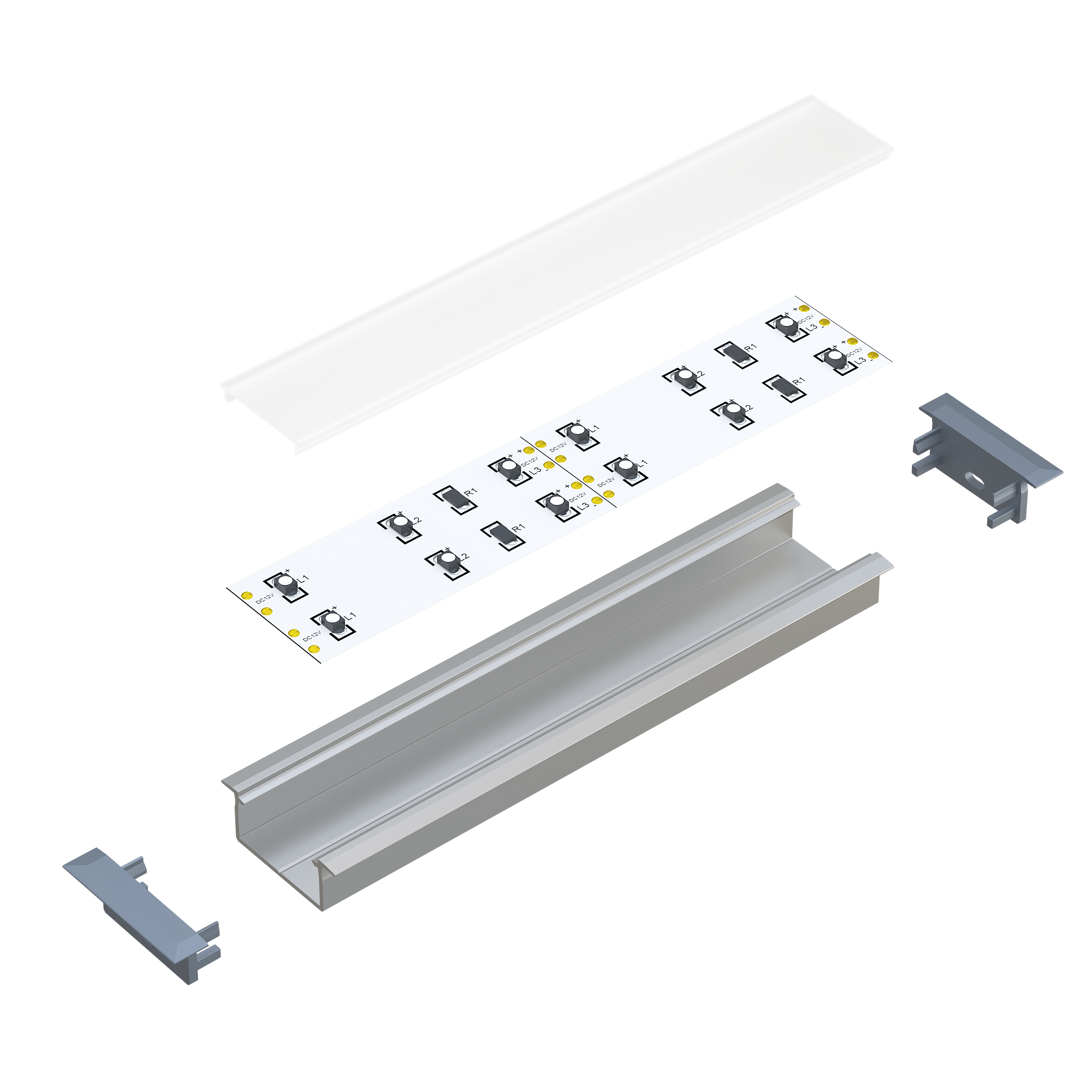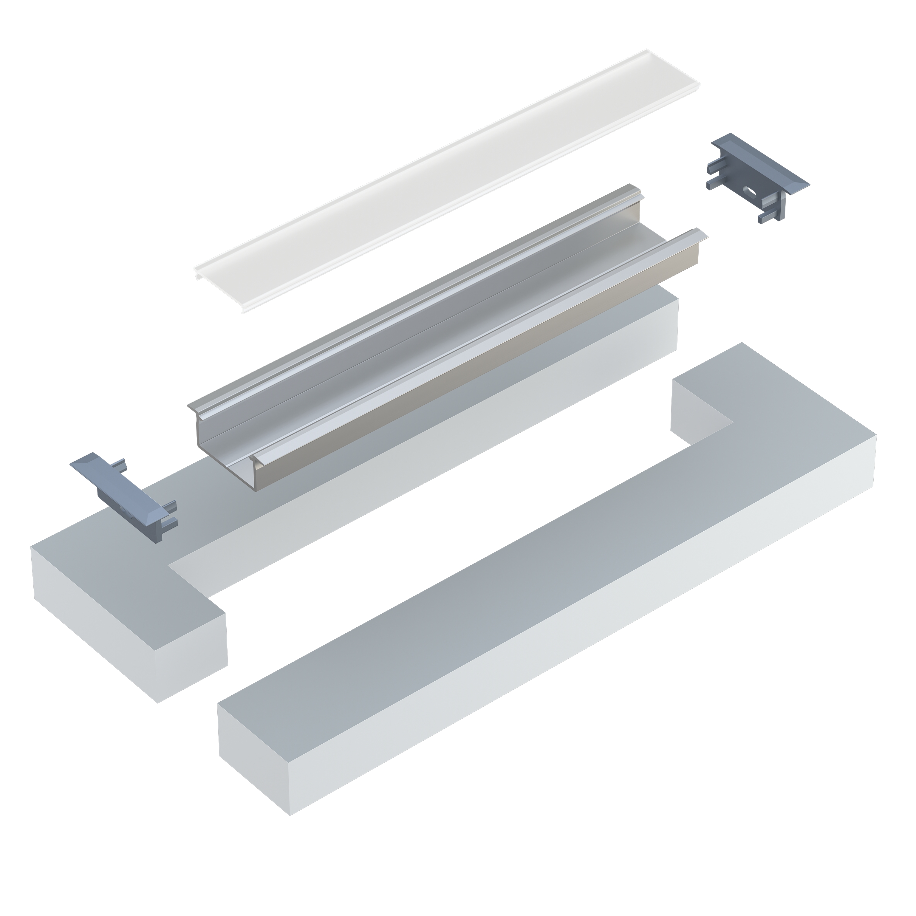 Rzut aksonometryczny przed montażem profilu GEMI w płycie meblowej 12mm z kloszem DOUBLE oraz zaślepkami bocznymi