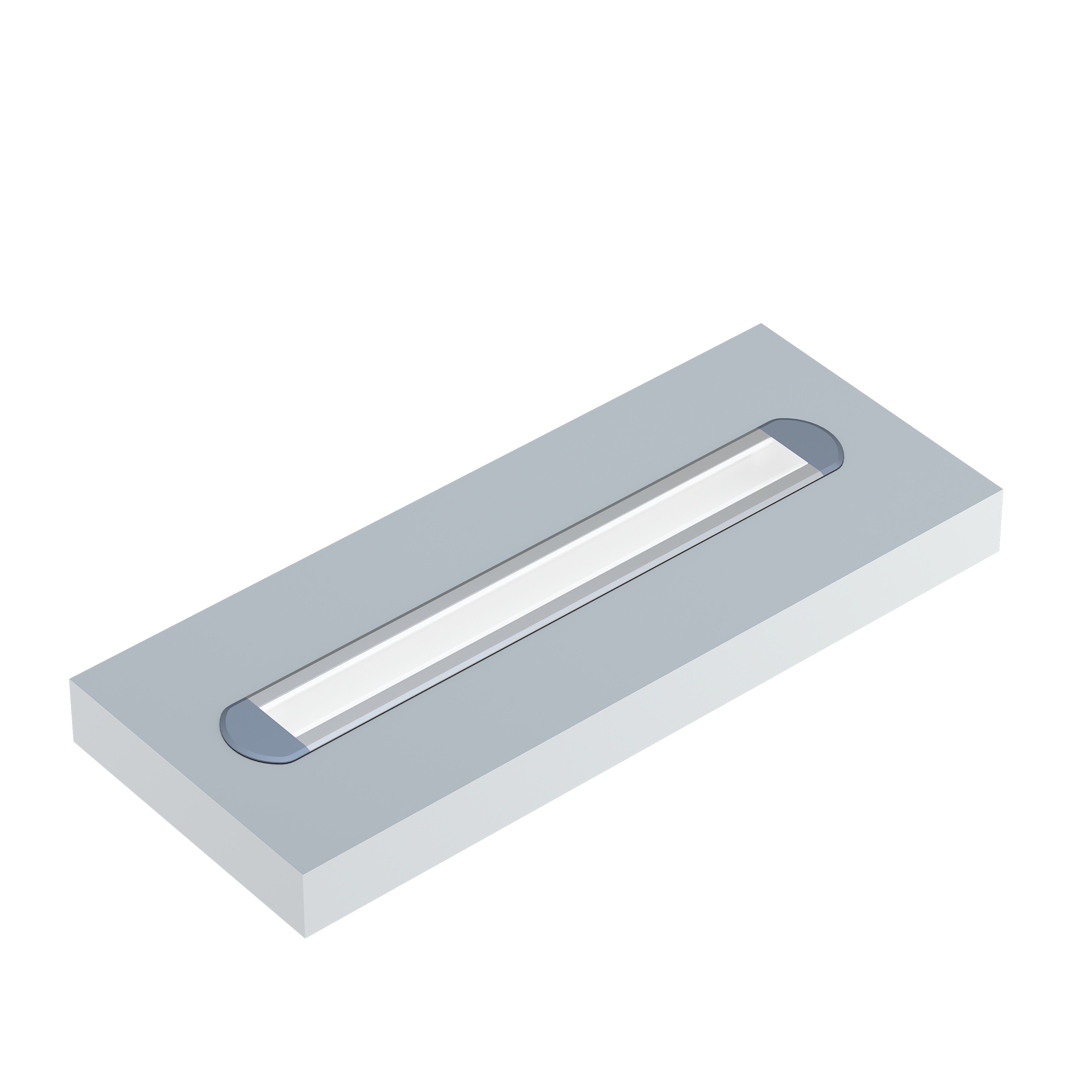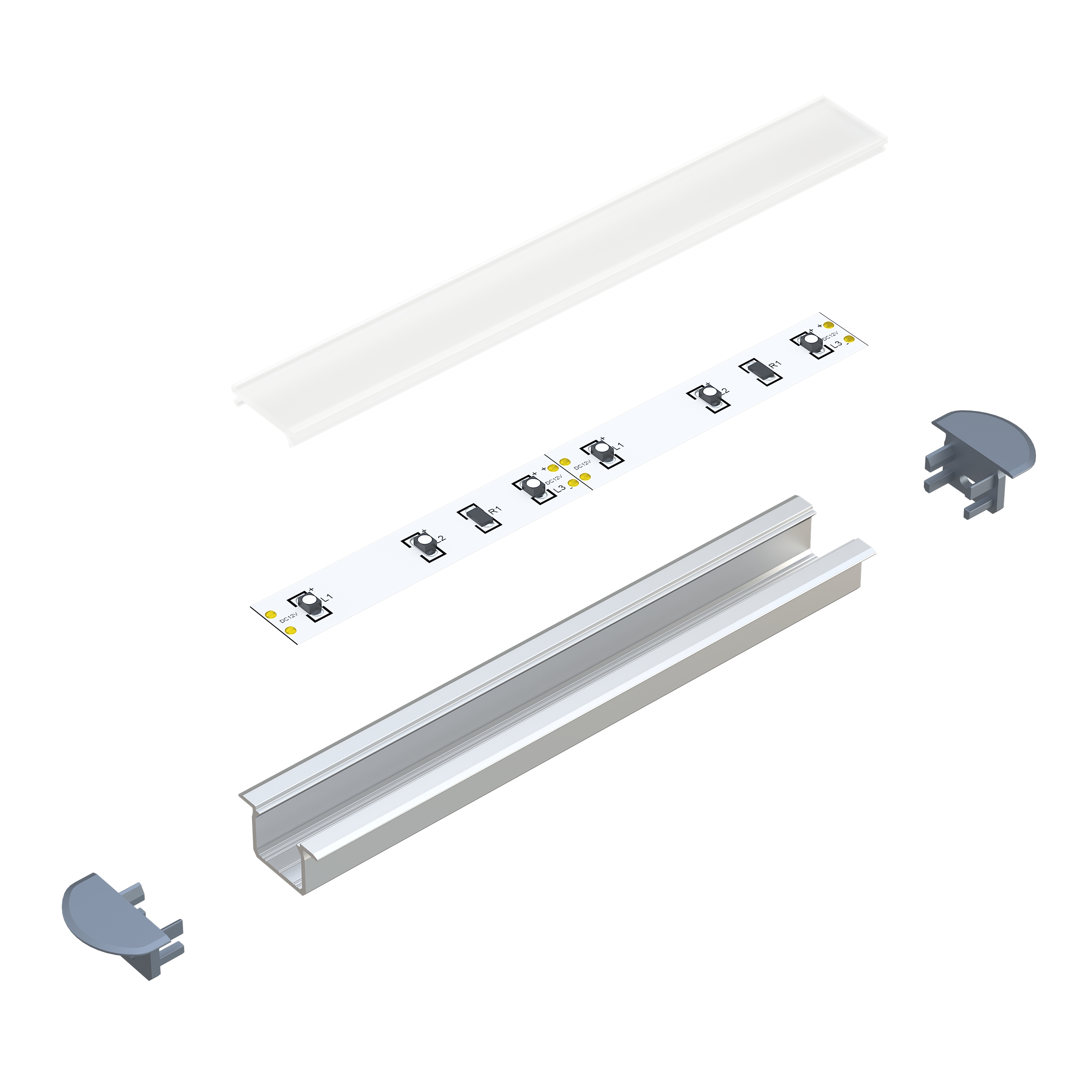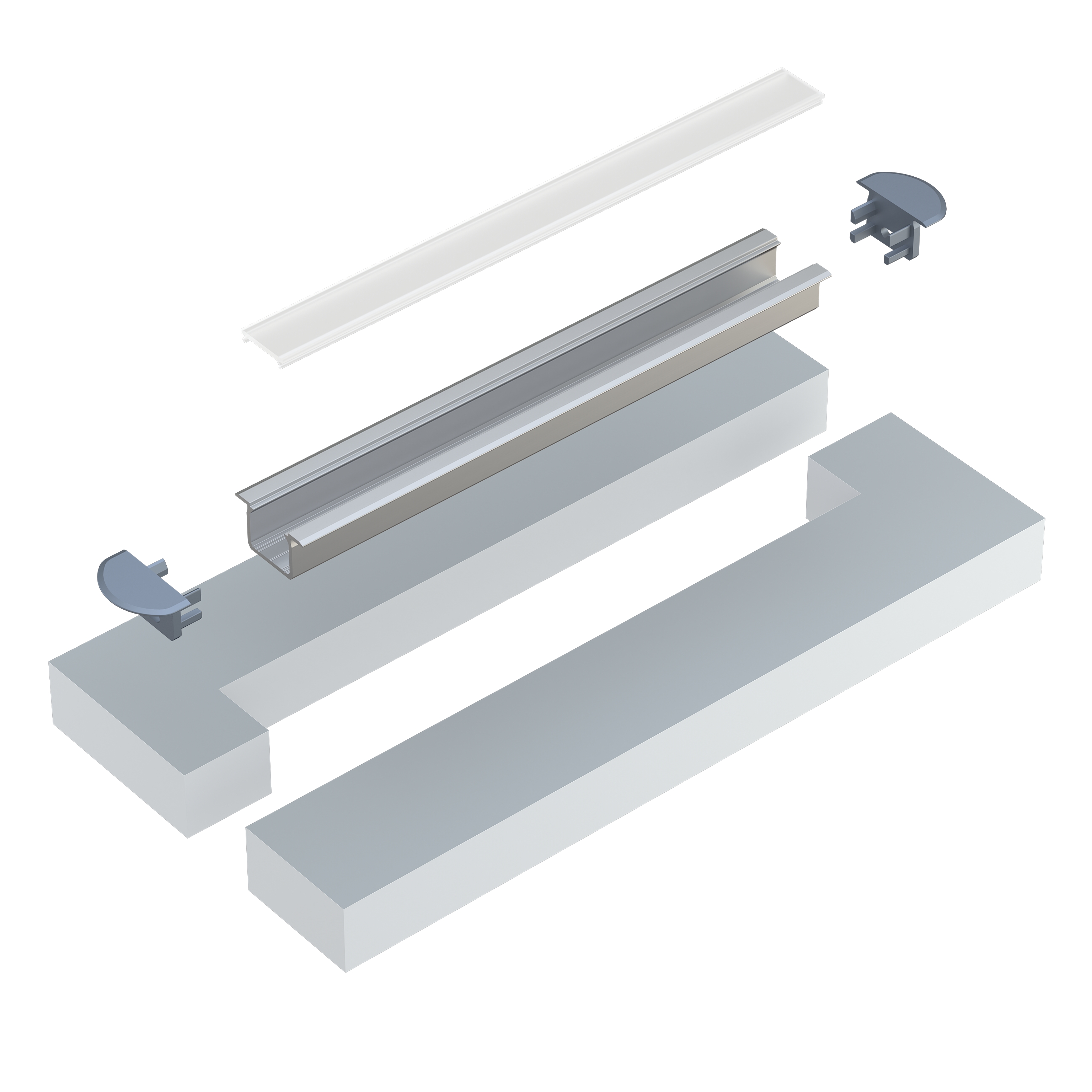 Rzut aksonometryczny przed montażem profilu U w płycie meblowej 12mm z kloszem BASIC oraz zaślepkami bocznymi