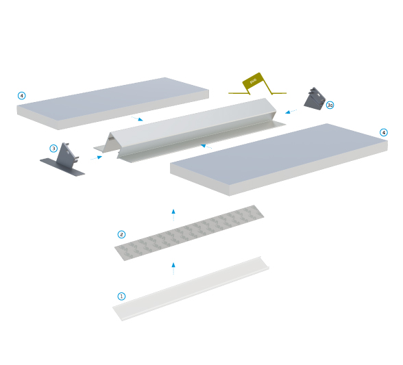 Schemat złożenia elementów systemu oświetleniowego z wykorzystaniem profilu DUO oraz klosza DOUBLE, taśmy LED, zaślepek