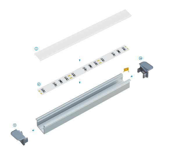Schemat złożenia elementów systemu oświetleniowego z wykorzystaniem profilu V oraz klosza BASIC, taśmy LED, zaślepek