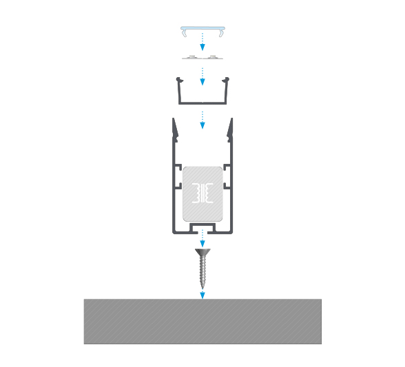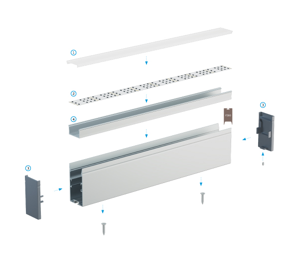 Schemat złożenia elementów systemu oświetleniowego z wykorzystaniem profilu FIXO, klosza DOUBLE, taśmy LED, profilu montażowego FIXO M1, zaślepek