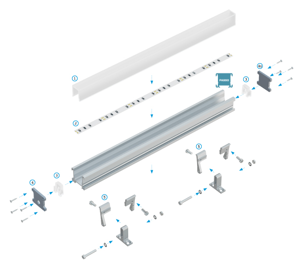 Schemat złożenia elementów systemu oświetleniowego z wykorzystaniem profilu LED FASSO, klosza SOLID,taśmy LED, zaślepek TAPO do klosza FASSO, zaślepki z otworem, zaślepki bez otworu i uchwytu montażowego FASSO.