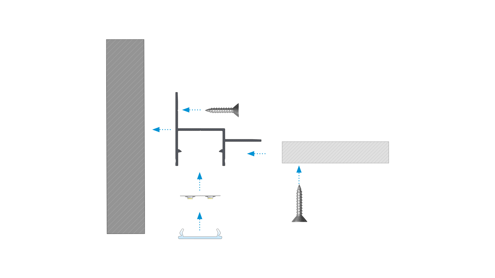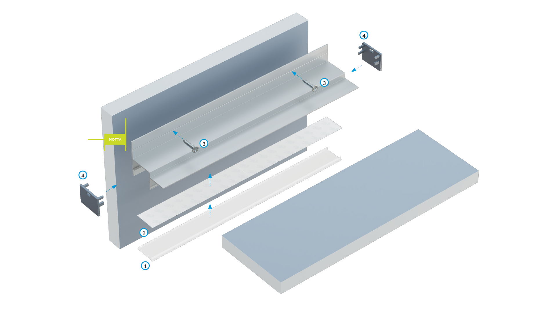 Schemat złożenia elementów systemu oświetleniowego z wykorzystaniem profilu MOTTA oraz (1) klosza DOUBLE, (2) taśm LED, (3) wkrętów montażowych oraz (4) zaślepek z otworem.