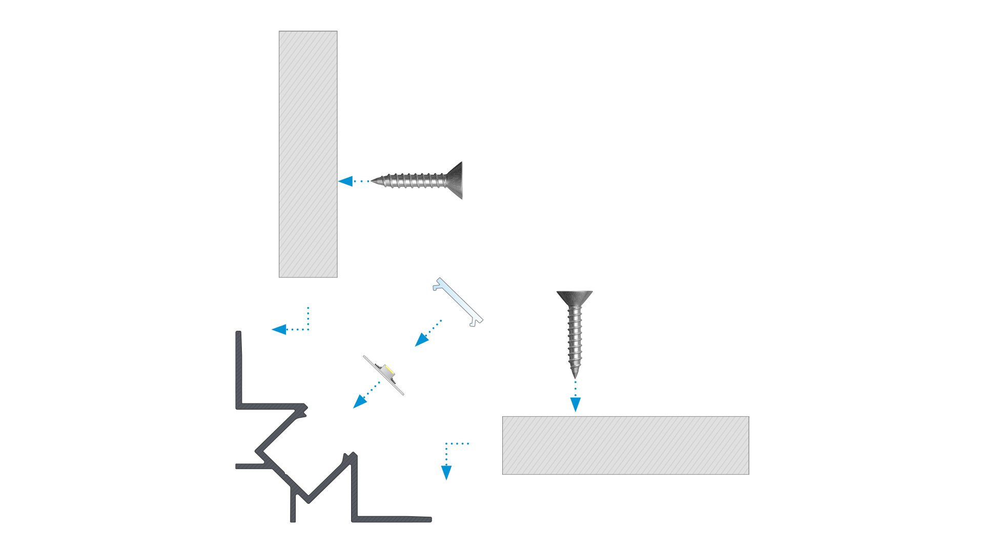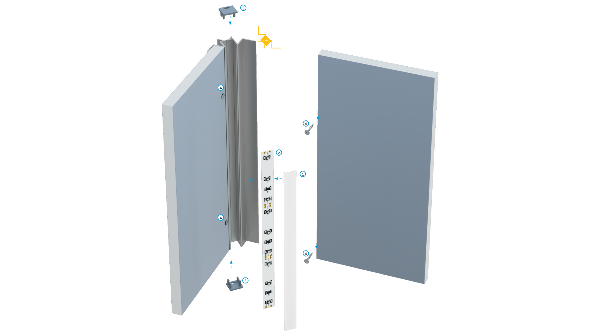 Schemat złożenia elementów systemu oświetleniowego z wykorzystaniem profilu VIGO oraz (1) klosza BASIC, (2) taśm LED, (3) zaślepek z otworem oraz (4) wkrętów.