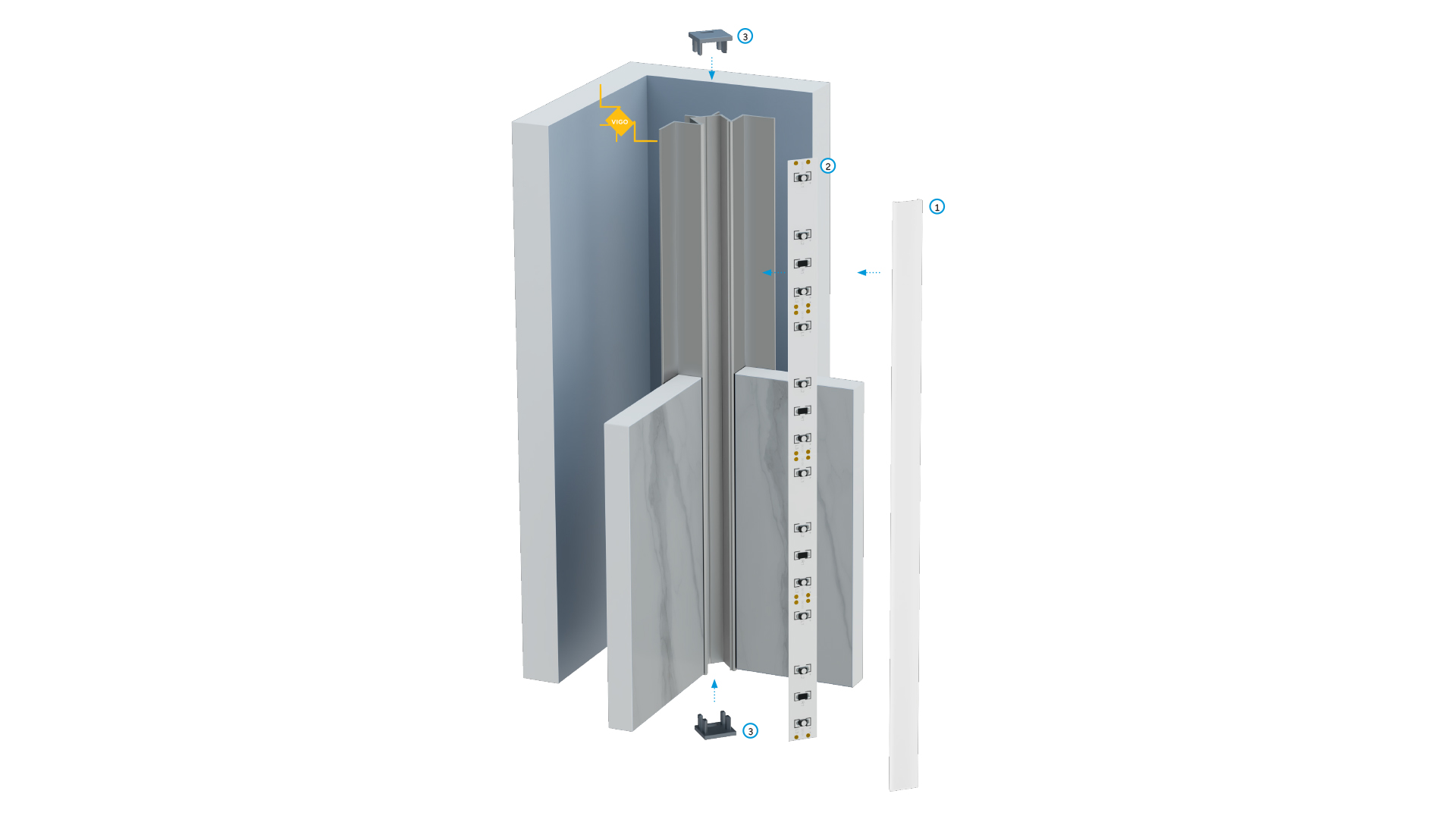 Schemat złożenia elementów systemu oświetleniowego z wykorzystaniem profilu VIGO oraz (1) klosza BASIC, (2) taśm LED, (3) oraz zaślepek z otworem.